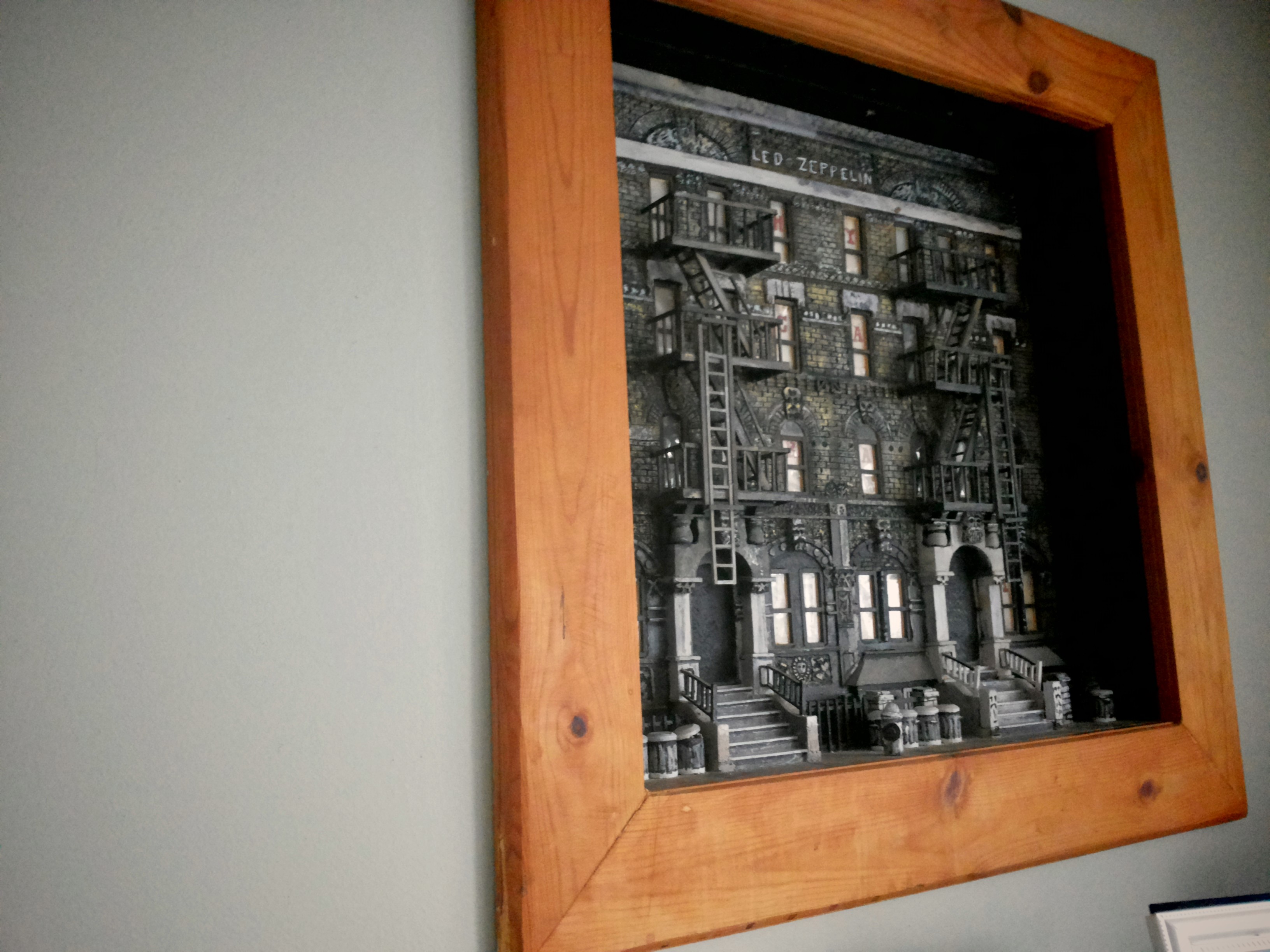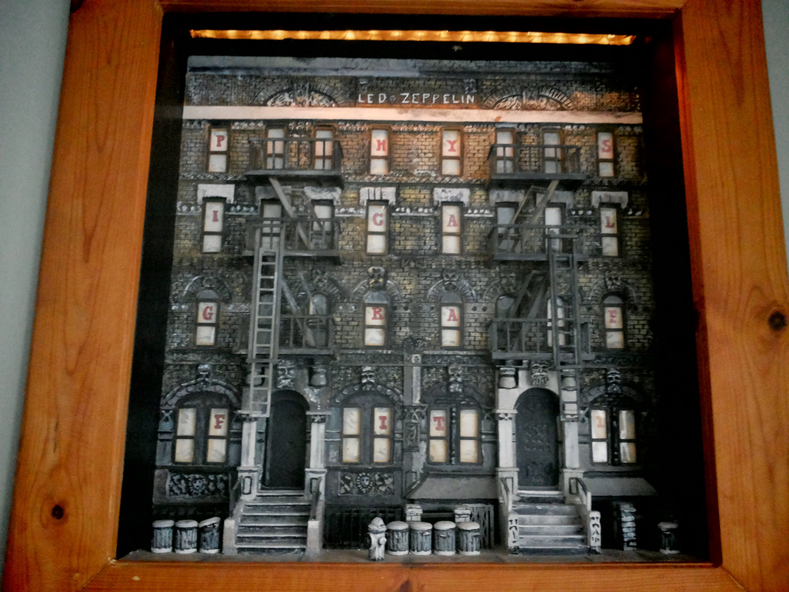 Physical Graffiti is carved by hand and mounted into the wall to highlight the 3D effect. All aspects of the street are elevated from the wall including ladders, steps and garbage cans. Lights added, giving a street light feel when the room is dim.