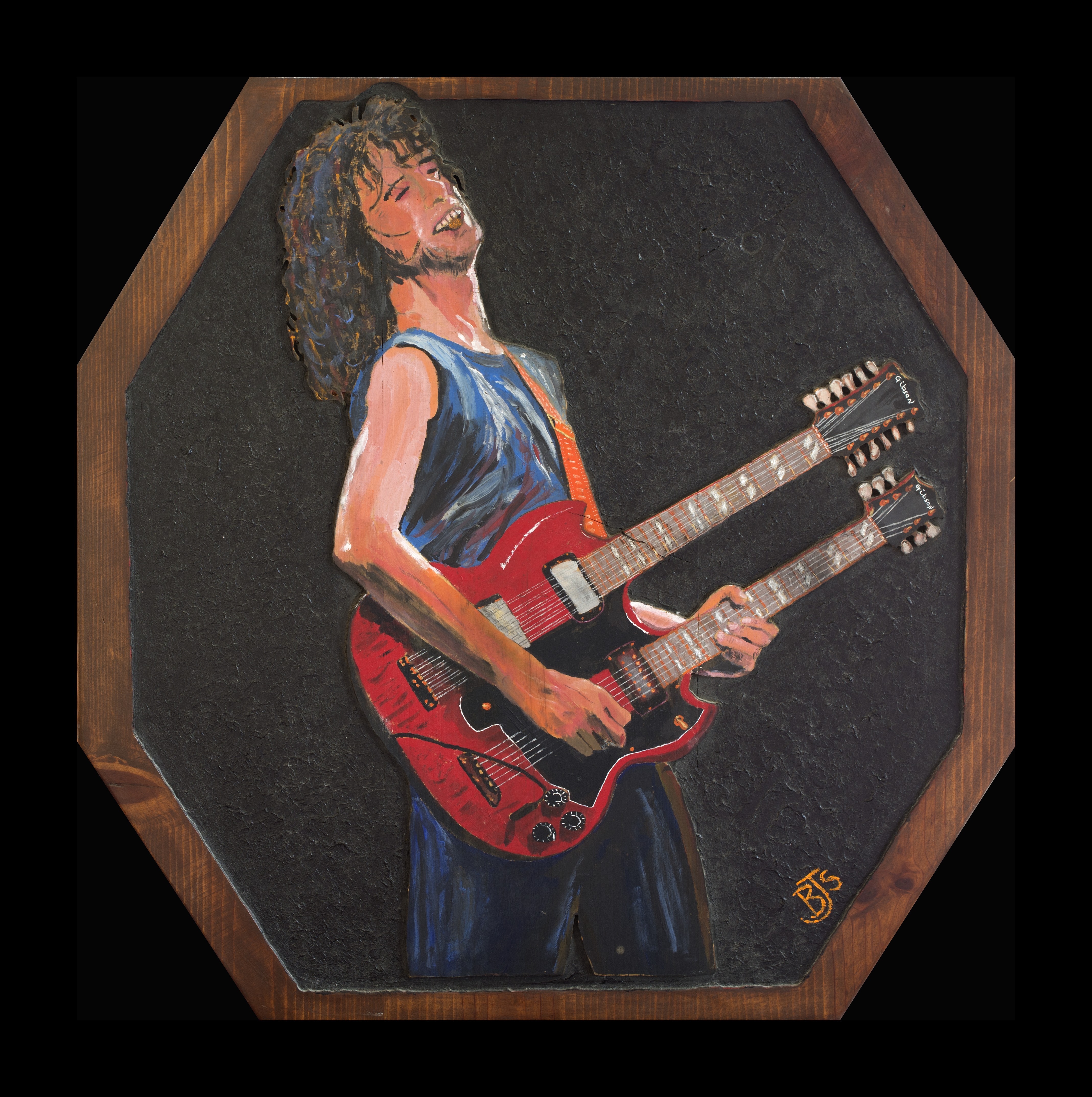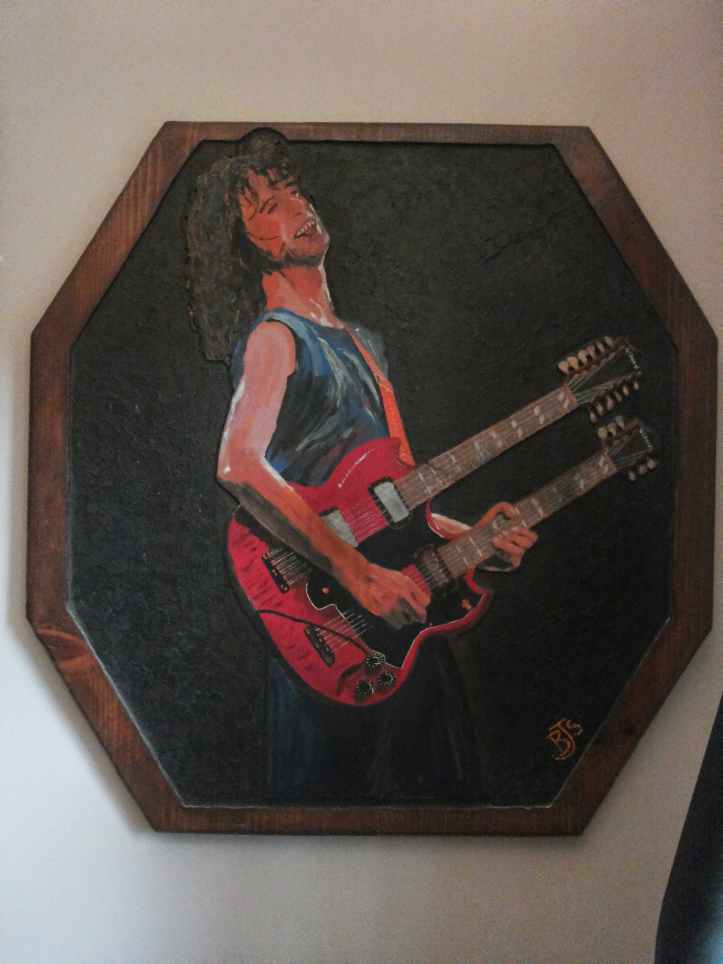 Here are a several pieces I did of Jimmy Page. Two are done on canvas while the middle piece is done on wood and carved using a router too allow for a more defined look and painted with acrylics. The first two can be found at Fine Art America!