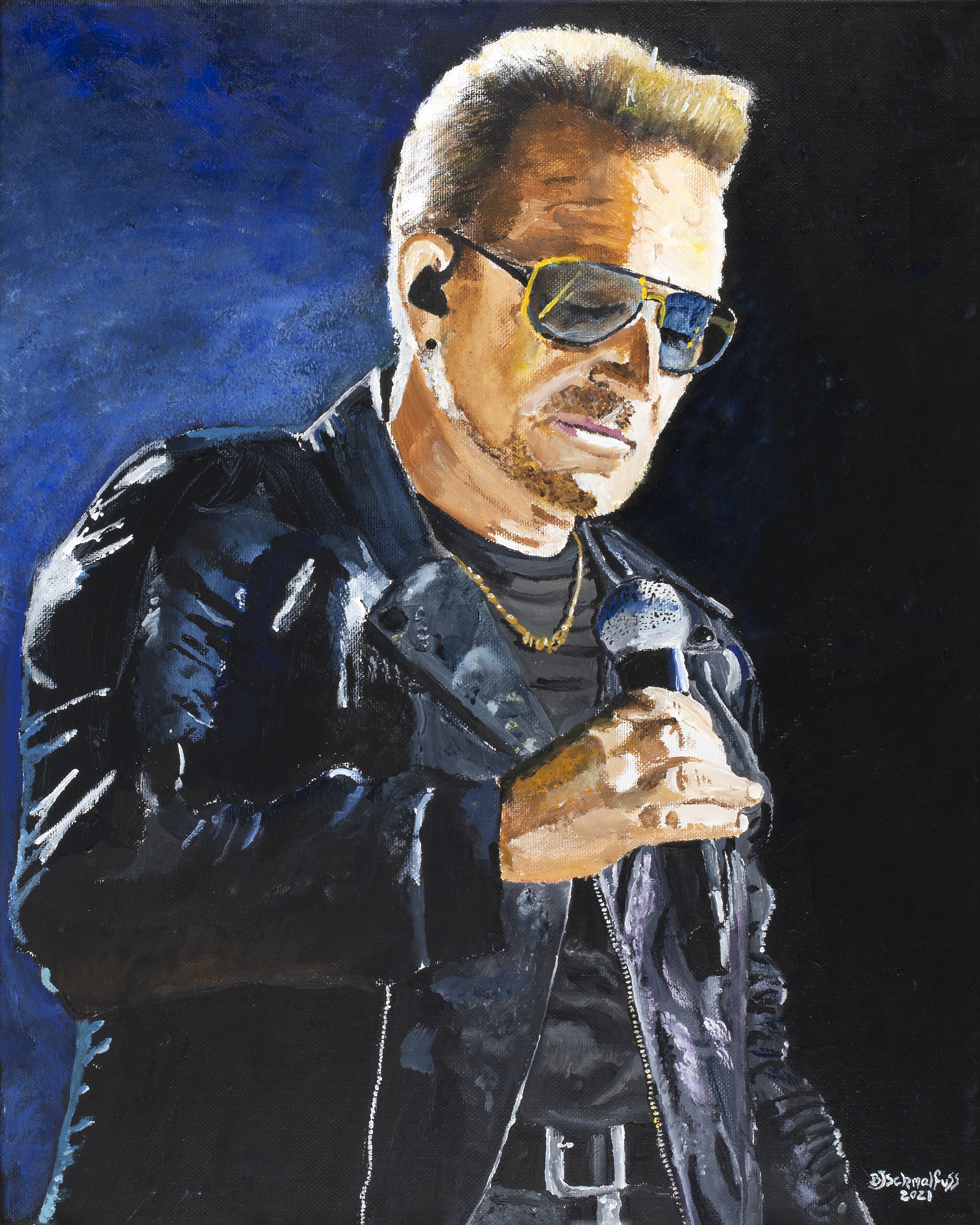 During the pandemic, it created a lot of time to paint so I looked at other artists I hadn’t done in a long time, if at all. Bono was one such name where I thought it was time to paint. You can probably tell, I tend to paint artists in their element, performing. Always passionate and expressive on stage, this moment shows him calm, about to sing another note.