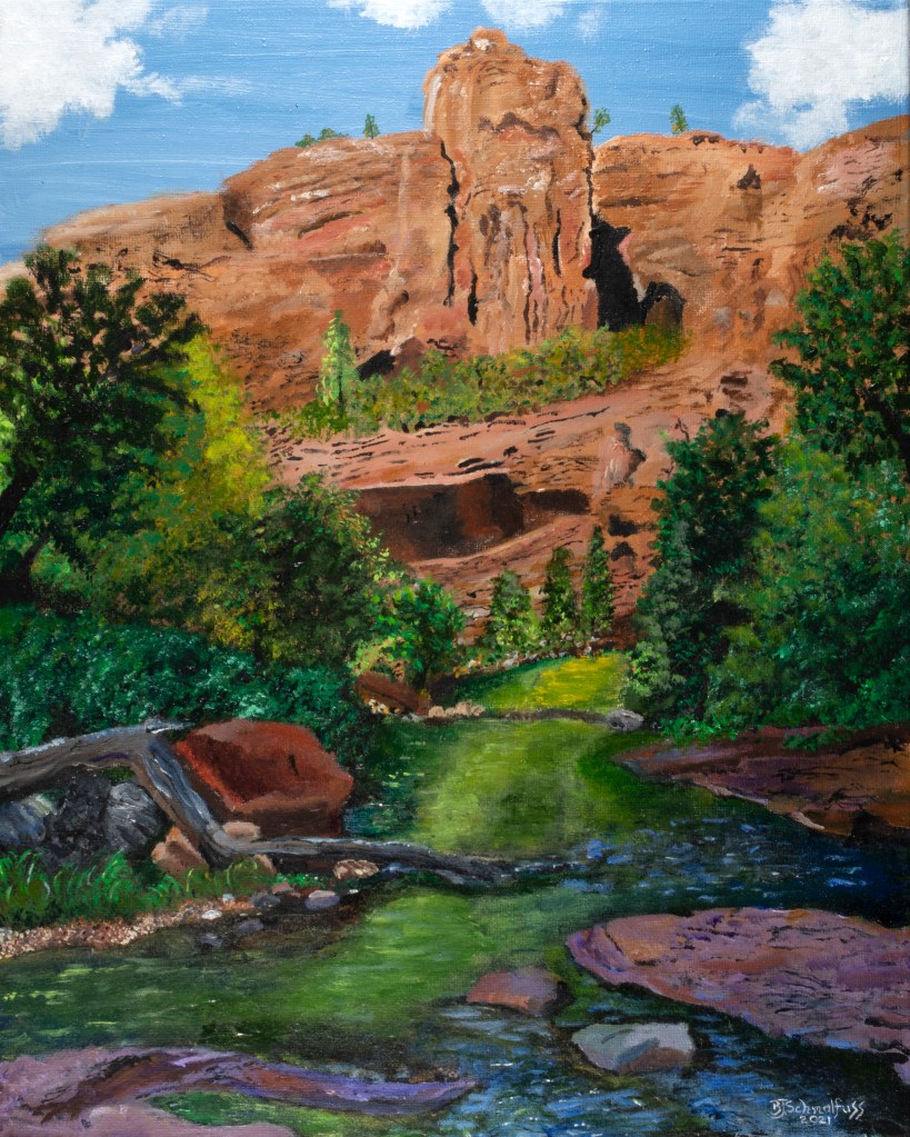 Sedona is a town in Azizona surrounded by red-rock buttes, steep canyon walls and pine forests. This particular image is a composite of three separate photographs I took while on walks. If this vantage point actually exists, I don’t know, I would have to go back. But of all the images I did take and subsequently reviewed I selected three to sketch out this idea. What do you think?